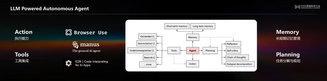 規劃的核心就是右下角的 Subgoal decomposition(子目標分解)。比如你要去倫敦旅游,可以拆成“早上吃早餐”“住在哪兒”等細項。當大語言模型具備了像人一樣的思考和推理能力,也就是有了“腦子”之后,它就能夠自動拆解任務。這是和過去的 Agent 最大的區別之一。
